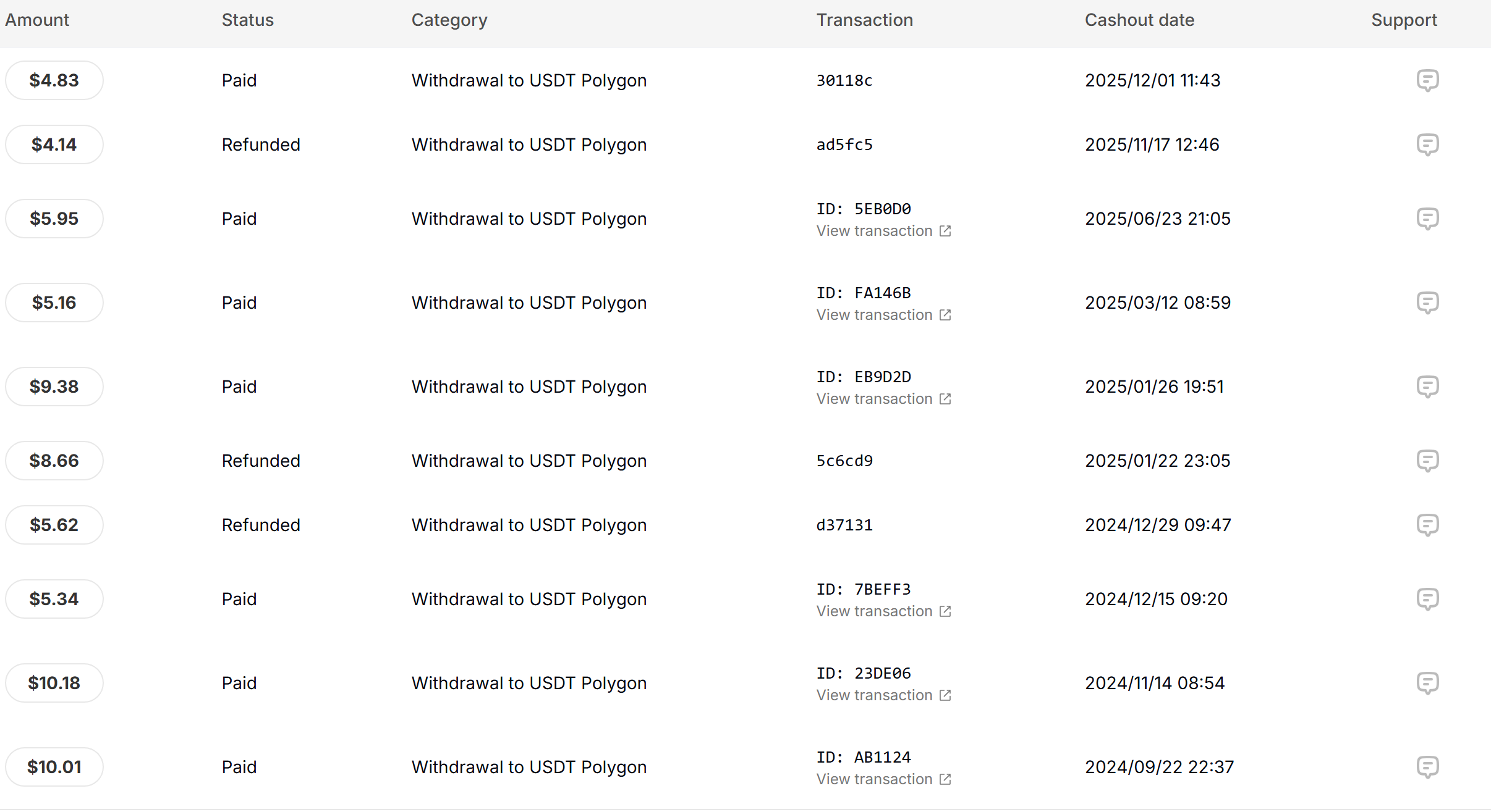 出金方式:USDT Polygon, Wise 等,门槛 2$